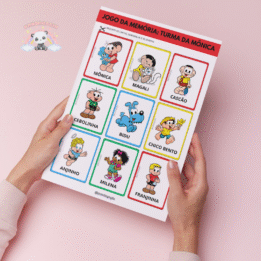 O arquivo traz 18 cartas (9 pares) ilustradas com os personagens mais queridos da Turma da Mônica, tornando a atividade ainda mais envolvente para as crianças.